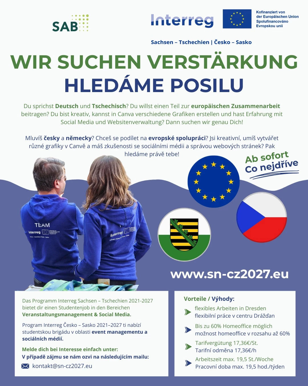 Im Gemeinsamen Sekretariat in der SAB, welches das sächsisch-tschechische INTERREG-Programm verwaltet, sind derzeit zwei Stellen ausgeschrieben.