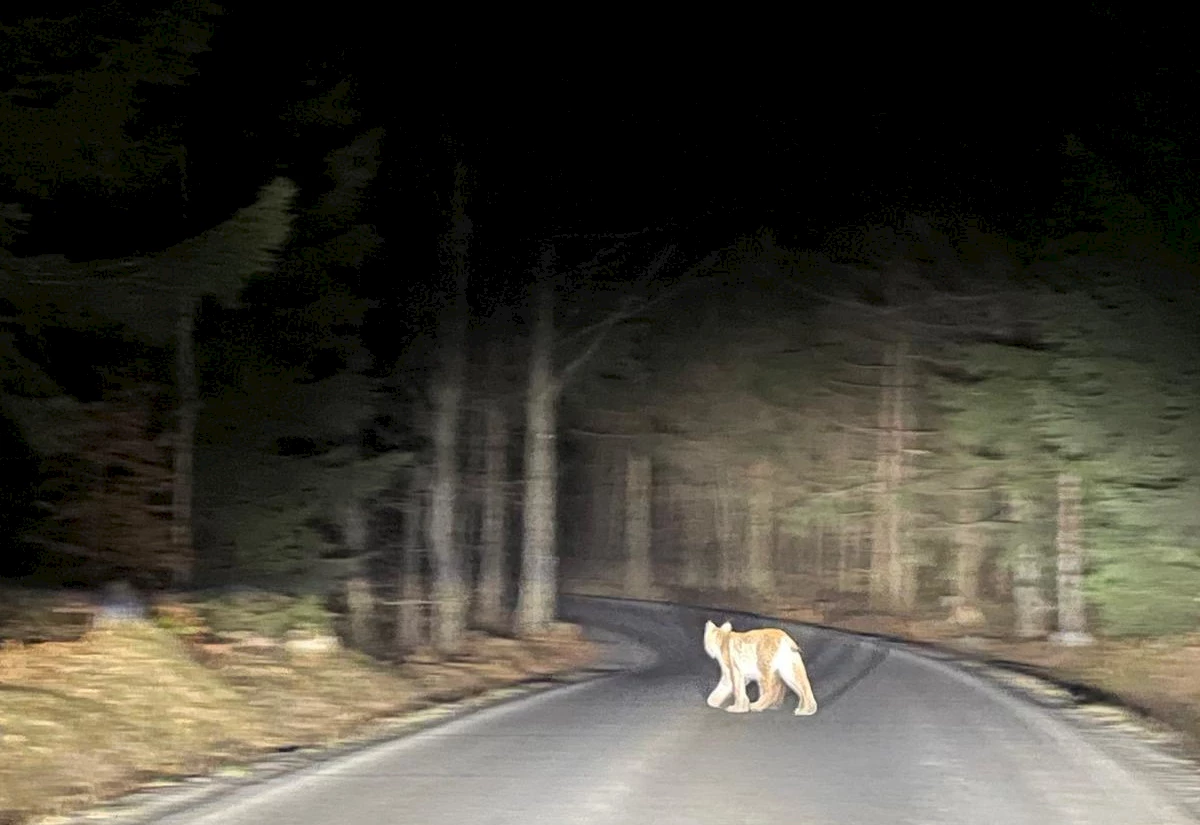 Freitag der 13. war für Familie Visokai ein Glückstag. In den späten Abendstunden gelang der Familie nämlich ein ganz besonderer Schnappschuss. Bei der Fahrt mit dem Auto nach Doubice sichteten sie einen Luchs. Das Tier bewegte sich zunächst im Wald am Straßenrand und es waren nur die leuchtenden Augen zu sehen, weshalb die Familie mit einem Fuchs rechnete. Geistesgegenwärtig bremste die Familie das Auto ab und hielt an. Das bewegte den Luchs dazu, sich so sicher zu fühlen, dass er vor den Augen der Familie die Straße querte. Die Fotos veröffentlichte der Nationalpark Böhmische Schweiz später auf seiner Webseite.