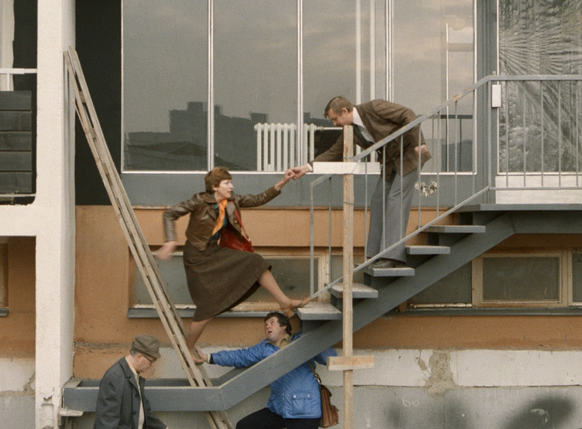Život nájemníků na pražském panelovém sídlišti, které je hotové teprve z poloviny, zůstává staveništěm. Mezi domy se musí mladé maminky prodírat blátem s kočárky a také v bytech je spousta problémů: tu se korpulentní muž zasekne kvůli nepohyblivým dveřím, tam neteče voda z kohoutku, ale potrubím se line dialog ze sousedního bytu. A z kotelny není úniku, protože chybí klika.
