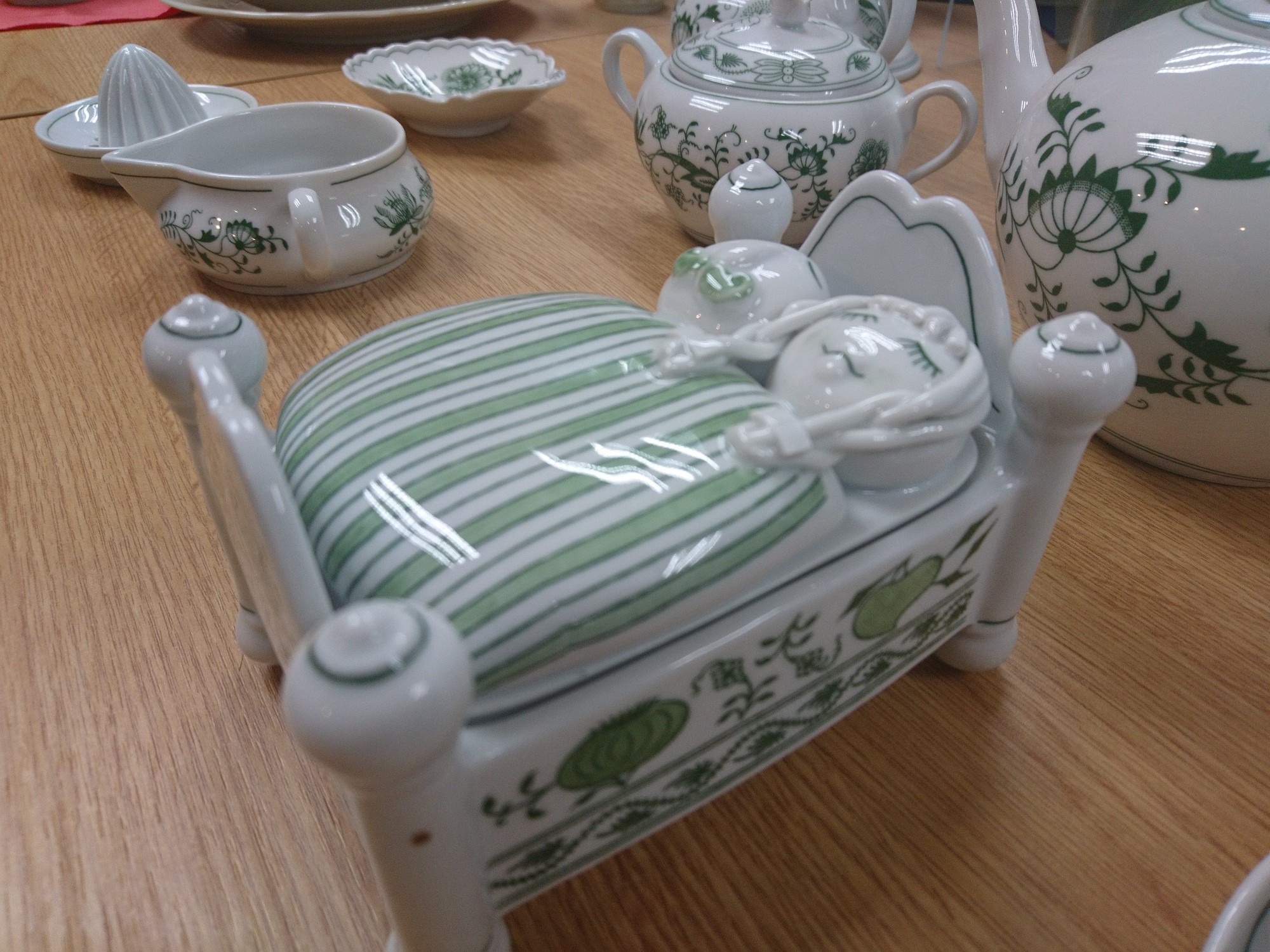 Porcelain has been decorated in Dubí since 1885 with a simple but richly modelled pattern, the Blue Onion pattern. The core of the exhibition consists of representative examples selected from an extensive porcelain collection, which today comprises almost seven hundred forms decorated with onion patterns. You can see the traditional onion decorated with underglaze cobalt blue on a porcelain rococo form. The name "porcelain with blue blood" also comes from this most used colour variant. However, there are also variants in which green or red was used instead of cobalt blue, as well as paintings in precious metal and ruby colours.
