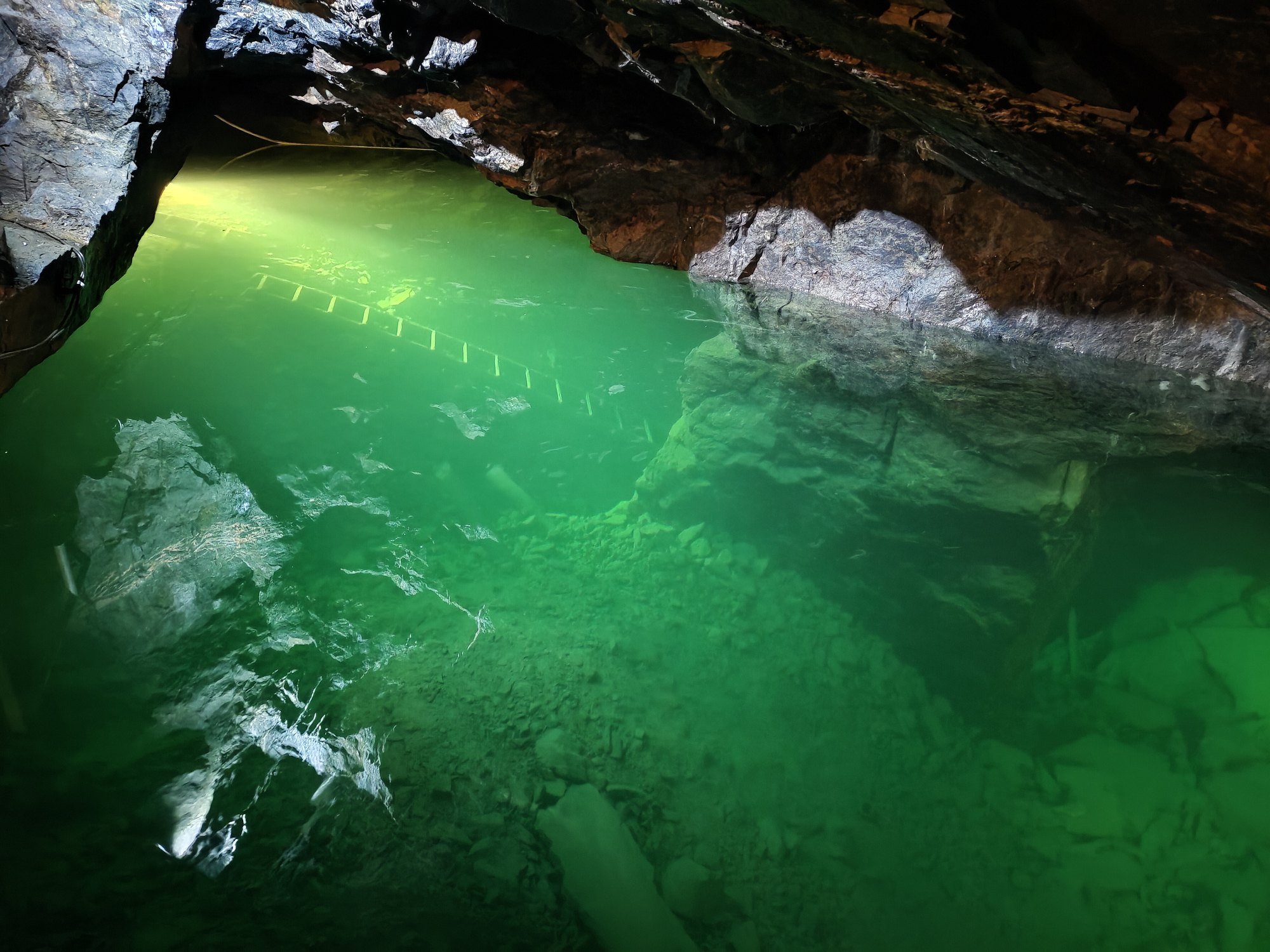 The expansion of the tunnel floor as a concrete path, the current water flow as well as the lighting and the modern expansion of the escape route in the former shaft are concessions to the requirements as a visitor company. Access to the underground lake is guaranteed by a massive staircase. The preserved historical sections of the route show a compact rock structure and typical route profile, which narrows the tunnel in short sections to 65 cm wide and almost 160 cm high.