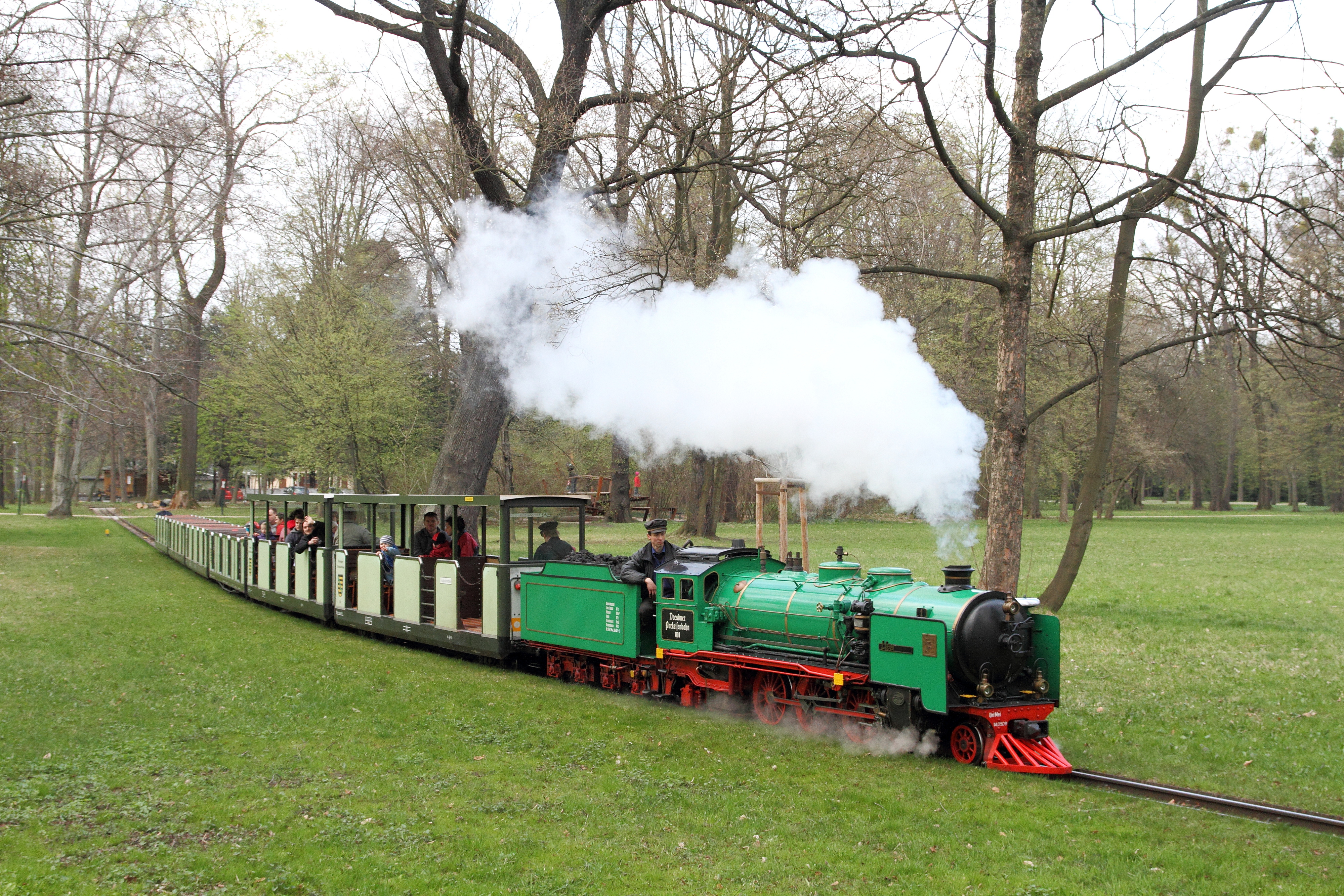 The Dresden Park Railway is a tourist attraction in the Grosser Garten. It also provides a worthwhile and useful leisure activity for 200 children and young people. Provided that the weather is fine, the trains generally run, from April to October, at intervals of 12 or 18 minutes. Passengers can begin and end their journey at any of the five stations: Hauptbahnhof an der Gläsernen Manufaktur, Zoo, Carola¬see, Karcherallee and Palaisteich. The gauge of this miniature railway is just 381mm (15 inches), and the 5.6 km round trip lasts 30 minutes. This is clearly a must for all railway fans. In 2015 we will celebrate the 90th anniversary of the two steam engines and the 65th anniversary of the Dresden Park Railway.