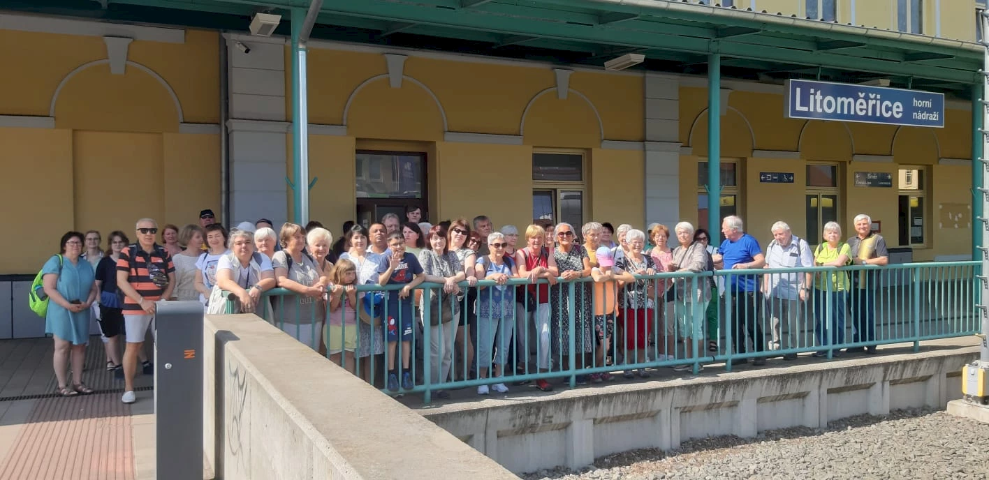 Da wir im Vorfeld bereits ein großes Interesse auch für diese Exkursion festgestellt hatten, wurde kurzerhand der Entschluss gefasst, diese Reise im Gegensatz zur ersten Planung nicht mit dem Bus, sondern auch mit dem Zug anzutreten. Da allerdings trotz guter Verbindung (je 2 x Umsteigen, aber mit sofortigem Anschluss) knapp 2 h Fahrt benötigt wurden, entschlossen wir uns, bereits den frühen Zug, 8.12 Uhr ab D. Poustevna und 8.18 Uhr ab Sebnitz zu nehmen. Um Zeit beim Ausfüllen der Teilnehmerliste zu sparen, trugen wir z. T. bereits die Namen der Angemeldeten ein, damit sie nur noch unterschreiben mussten. Das hat sich jedoch nicht bewährt, da einige Personen wegen der Hitze oder aus anderen Gründen nicht teilnehmen konnten.
