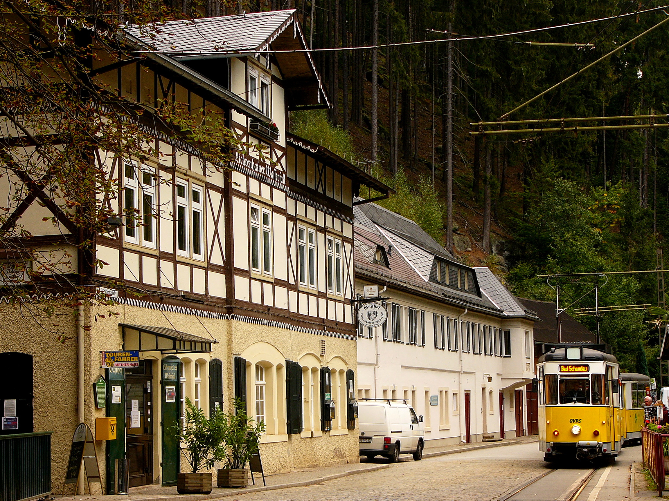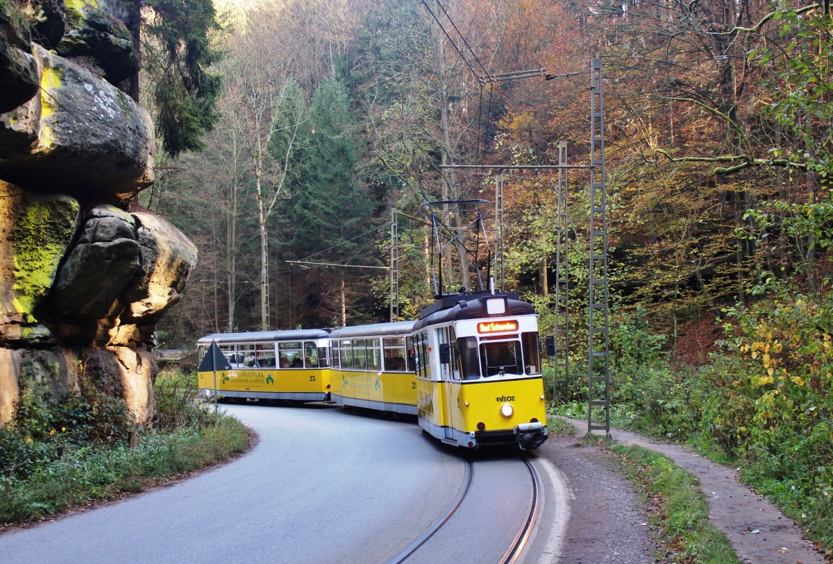 Seit 1898 befördert die Kirnitzschtalbahn Wanderer, Touristen und Kurgäste zu ihren Zielen. Sie wurde von Anfang an als Ausflugsbahn geplant. Auf etwa 8 Kilometern begleitet die meterspurige Bahn das Flüsschen Kirnitzsch auf seinem Lauf durch die bizarre Felsenwelt des Elbsandsteingebirges von Bad Schandau zum Lichtenhainer Wasserfall. Die Fahrt dauert 25 Minuten, im Sommer wird im Halbstundentakt gefahren.