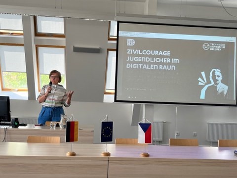 Ausgehend von diesem Grundverständnis stellten Sarah Junghans und Yvonne Bonfert die einzelnen Bausteine des Projekts vor: digitale und analoge Zivilcourageausbildung der Studierenden, ein Blockseminar in Ústí, Exkursionen noch Most und Dresden sowie die Schulworkshops, die unter Anleitung des Aktion Zivilcourage e.V. von den Studierenden vorbereitet und gehalten wurden. Auch der Vortrag selbst hatte Workshop-Charakter. Die Teilnehmenden diskutierten etwa, wann sie das letzte Mal mutig waren und was für sie eigentlich zivilcouragiertes Handeln ist. Auch wenn es hier in Detailfragen Unterschiede gab, so war doch allen klar: Wir brauchen Zivilcourage, gerade in der Grenzregion.